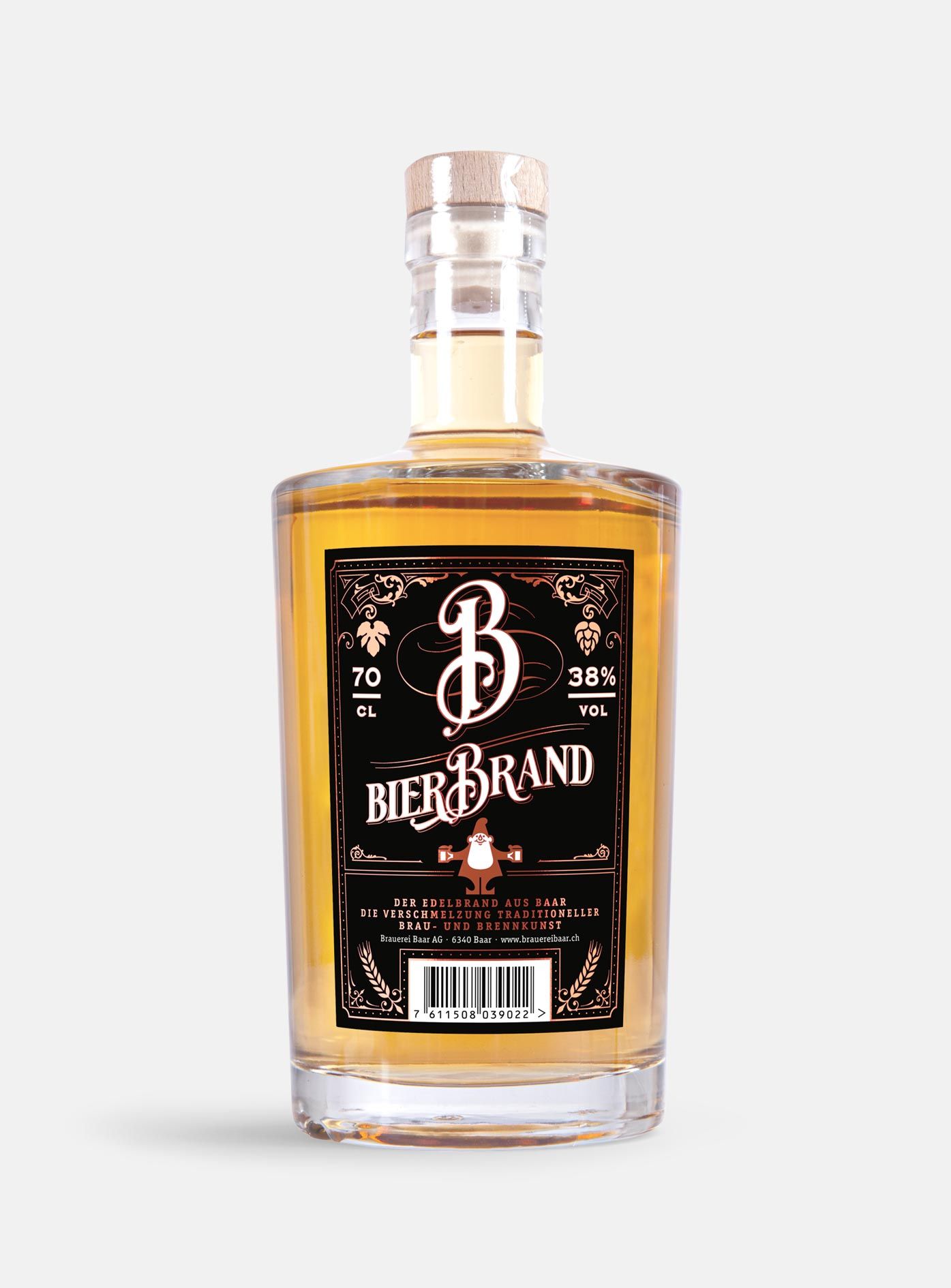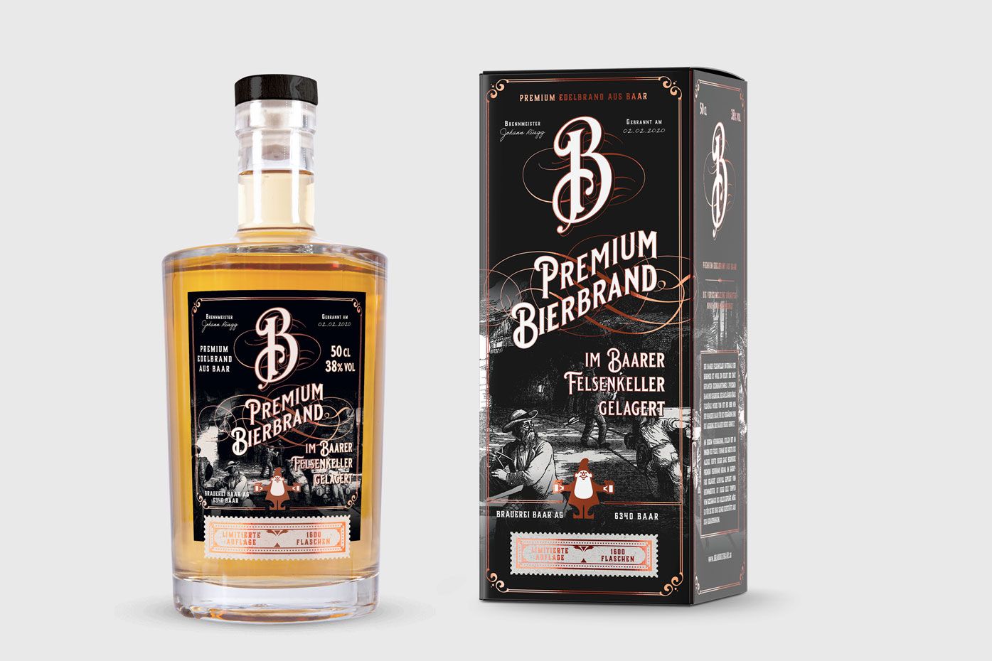 Bierbrand ist eine Rarität und bei Geniessern relativ unbekannt. Wer dieses köstliche Destillat aus würzigem Baarer Bier jedoch kennt, schätzt es als Digestif der speziellen Sorte. Der Felsenkeller unterhalb der Baarer Burgweid ist ein Relikt aus längst vergangenen Tagen. In der Zeit der Urgrosseltern unserer Urgrosseltern, um 1850, entstand dieser vermutlich rund um die Bauarbeiten der ehemals geplanten Bahnlinie Zug-Inwil-Baar-Sihlbrugg. An diesem verborgenen, stillen Ort im Innern des Felses, fernab der Hektik des Alltags, reifte dieser ganz besondere Premium Bierbrand heran. Im Sherry-Fass gelagert, liebevoll gepflegt vom Brennmeister, ist dieser edle Tropfen vom Geschmack des Holzes geprägt. Der Bierbrand wie auch der Premium Bierbrand nehmen gestalterisch diese Zeitepoche auf und zeigen den damaligen beharrlichen Pioniergeist.